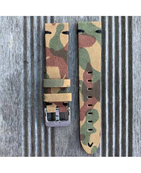 Conçu avec un **design original** et **exclusif**, cet accessoire d’horlogerie se distingue par son allure raffinée. Réalisé en cuir de **vachette suédé** au tannage végétal, il arbore un imprimé **camouflage** en surface qui lui confère une allure unique. Son cuir est issu des tanneries toscanes les plus **prestigieuses**, garantissant une qualité sans compromis. La coupe franche latérale et la **couture minimaliste** noire apportent une touche de sophistication discrète, tandis que sa structure plate et fine assure un **confort inégalé**.